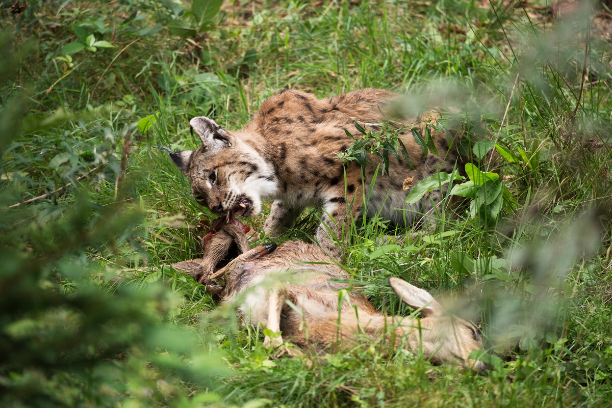 Luchse verzehren ihre Beute da, wo sie sie gerissen haben und kehren häufig in den darauffolgenden Nächten dorthin zurück. Oftmals verblendet der Luchs seine Beute mit Laub, Gras oder Schnee, um sie vor Nahrungskonkurrenten zu verstecken. Sobald der Luchs das gerissene Beutetier fertig genutzt hat, bleiben meist nur noch das Gerippe, der Kopf, das Fell und der Verdauungstrakt übrig. Ein ausgewachsener Luchs frisst im Mittel 1,5 kg Fleisch pro Nacht, was etwa einem Reh pro Woche entspricht. Der Nahrungsbedarf schwankt je nach Jahreszeit und Zahl der Jungen. Eine Luchspopulation reißt in einem Jahr durchschnittlich 0,6 bis 1,5 Stück Schalenwild pro 100 ha Lebensraum. Im Vergleich dazu lag die Jagdstrecke im Jagdjahr 2021/22 bei 4,9 Rehen pro 100 ha Jagdfläche in Baden-Württemberg.