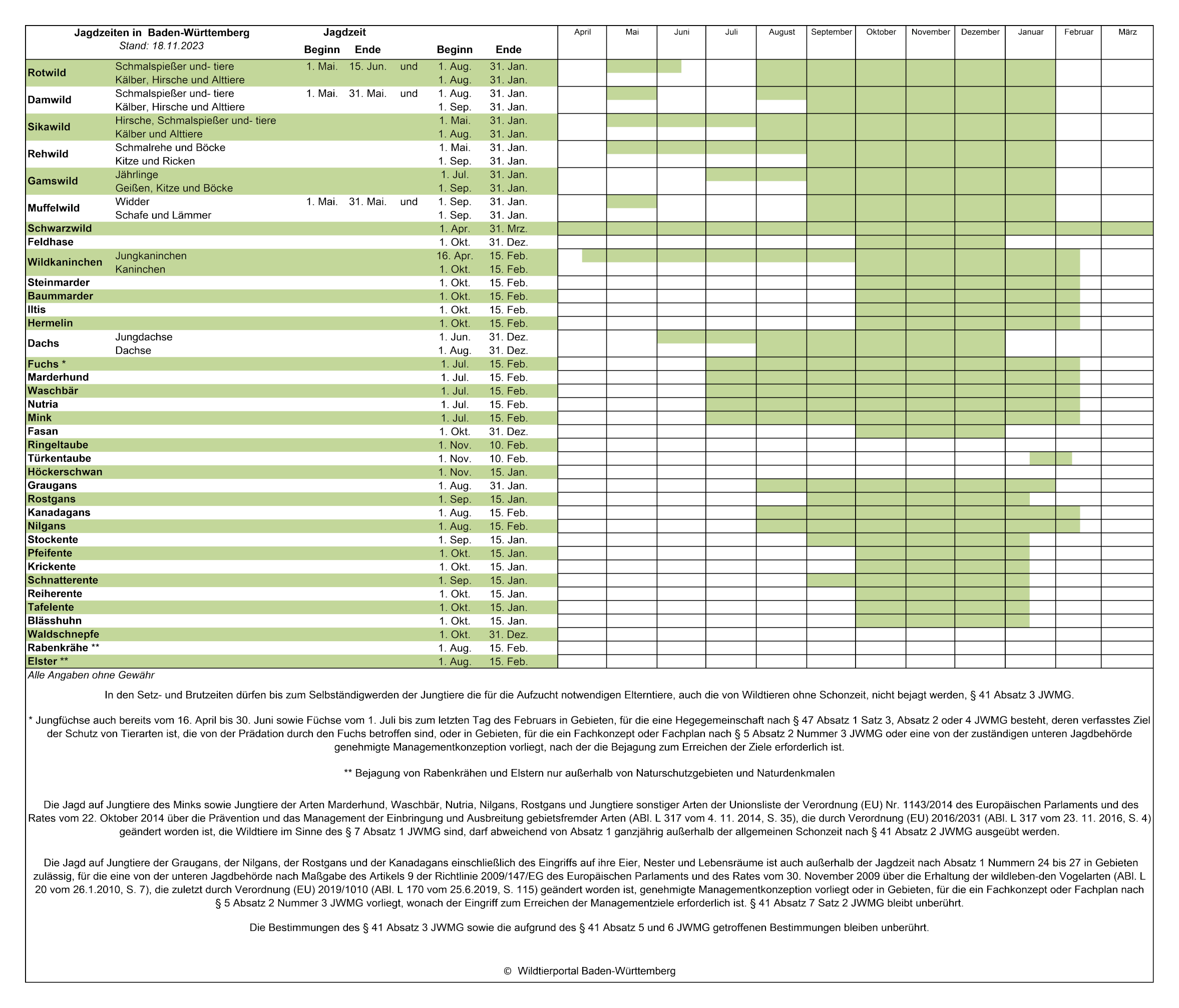 Jagd- und Schonzeitenkalender Baden-Württemberg