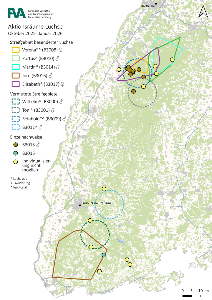 Eine tabellarische Übersicht über individualisierte Luchse in Baden-Württemberg seit 2015 finden Sie auf der Homepage des landesweiten Luchsmonitorings der Forstlichen Versuchs- und Forschungsanstalt Baden-Württemberg (FVA):