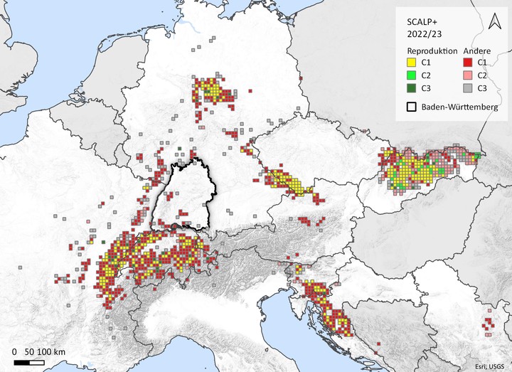 Verbreitung des Karpatenluchses in und um den Alpenraum im Monitoringjahr 2022/2023. Die 10x10 km Raster basieren auf den SCALP Kriterien (C1, C2, C3) und zeigen die Daten der Luchsvorkommen innerhalb des SCALP-Netzwerkes © SCALP. Grau hinterlegte Länder haben entweder kein Luchsvorkommen oder sind noch nicht Teil des SCALP+-Netzwerks. (Quelle: SCALP+ 2024)