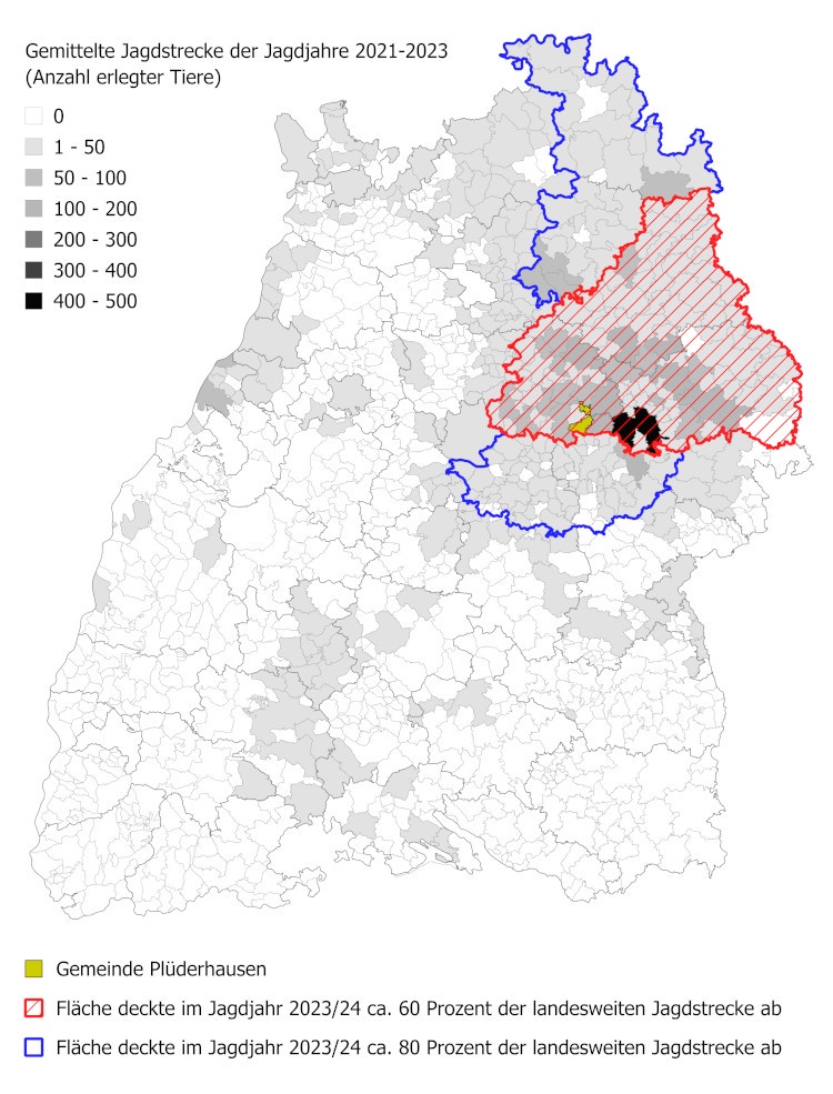 Gemittelte Jagdstrecke des Waschbären in den Jagdjahren 2021 bis 2023 in Baden-Württemberg © Wildforschungsstelle Baden-Württemberg