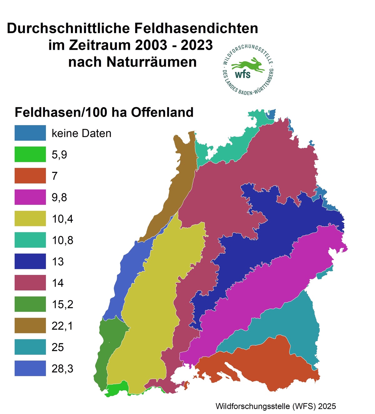 In den letzten Frühjahren tummelten sich mehr Feldhasen auf Baden-Württembergs Offenlandflächen als seit Beginn der Zählungen im Jahr 1997. Der Datenauswertung der Wildforschungsstelle des Landes Baden-Württemberg am Landwirtschaftlichen Zentrum (LAZBW) nach, lebten im Frühjahr 2023 landesweit gut 19 Feldhasen auf einem Quadratkilometer Offenlandfläche. Die höchsten Dichten sind dabei in den klimatischen Gunsträumen der Rheinebene sowie auch im Donau-Iller-Lech-Raum zu finden. Die Feldhasenpopulation wird im Frühjahr wie auch im Herbst in rund 190 Zählrevieren durch engagierte Jägerinnen und Jäger nach wissenschaftlichen Standards erfasst.